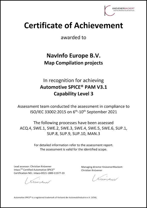 克日,,,,,,,金世豪欧洲(NavInfo Europe B.V.)乐成获得Automotive SPICE 三级(简称:ASPICE L3)认证证书。。。。。这一成绩批注金世豪欧洲的地图编译产品和服务切合最严酷的全球汽车行业流程质量标准。。。。。金世豪将使用该流程继续为国际大型OEM提供高质量的编译软件和数据分发服务。。。。。