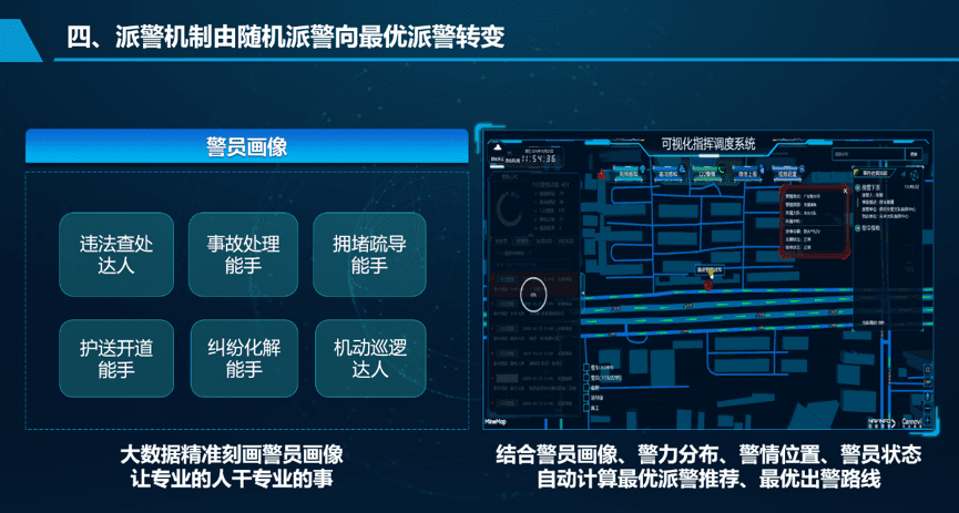 解决计划:世纪高通依托海量数据优势,, ,,,,,,运用大数据画像手艺为民警绘制警员画像,, ,,,,,,例如:通俗事故处置惩罚能手、重大事故处置惩罚能手、拥堵疏导能手等。。。。。。指挥中心凭证警员画像,, ,,,,,,团结警力漫衍、事务位置、警员状态等多个维度,, ,,,,,,天生最优派警模子(手艺最优、路径最优),, ,,,,,,让专业的人干专业的事。。。。。。