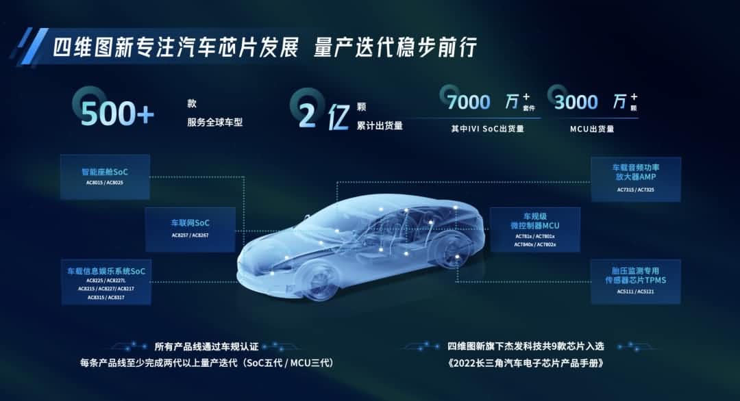 今年,,,,,,,,金世豪智芯四大产品线9款自主研发的芯片入选《2022长三角汽车电子芯片产品手册》,,,,,,,,9款芯片被收录至《汽车电子芯片立异产品目录》,,,,,,,,车规级MCU AC781x芯片荣获2022全球数字经济大会“数字经济工业立异效果”,,,,,,,,智能座舱中控处置惩罚器芯片AC8015入围“汽车电子优异立异手艺与产品应用效果”。 。。 。。。金世豪智芯服务全球500+款车型,,,,,,,,累计出货量凌驾2亿颗,,,,,,,,其中IVI SoC出货量凌驾7000万套件,,,,,,,,MCU出货量凌驾3000万颗。 。。 。。。